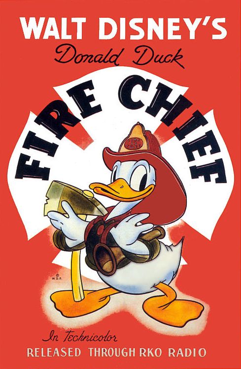Feuerwehrmann Donald versucht mit Hilfe der Neffen seine eigene Feuerwehrwache zu löschen.